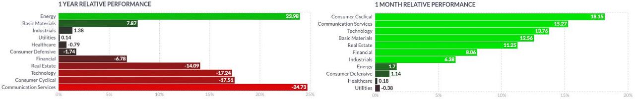 두 지표 모두 장기 EMA200에서 크게 나타났고 MMFI는 연장된 것으로 보이지만 MMTH는 긍정적인 모멘텀을 보여 단기적으로 이러한 추세가 지속될 것임을 암시할 수 있습니다. 대부분의 부문은 지난 달에 상당한 반전을 달성할 수 있었으며, 연간 관점에서 3개의 후발 주자들은 지난 몇 주 동안 가장 큰 이익을 보고했으며 시장 침체기에 심하게 매도된 후 시장 회복을 이끌고 있습니다.