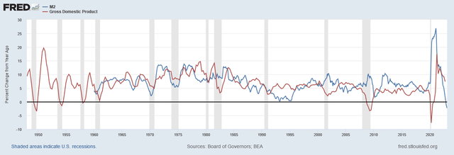 드문 형태로 미국의 M2 화폐 주식 성장이 마이너스가 되었습니다. 1960년 이후 가장 부정적입니다. 2020-2021년 M2 화폐 주식의 극적인 상승을 감안할 때 이것은 놀라운 일이 아닙니다. 다시 말하지만, 이는 추세에서 상당한 편차가 종종 과잉 수정을 초래한다는 우리의 기대와 일치합니다. M2의 변화는 GDP와 적당한 상관관계가 있습니다. 1970년대 내내 M2의 변화는 GDP의 변화에 밀접하게 반영되었습니다. 2001년, 2008년, 2020년의 상당한 경기 침체 기간 동안 M2와 GDP는 경기 순환을 전환하기 위해 통화 부양책이 사용됨에 따라 갈라졌습니다. 2020년 경기 침체 이후 M2의 급증은 6~12개월 지연되어 GDP 성장에 반영됩니다. M2 통화량 증가율은 2022년 12월에 마이너스가 되었습니다. 이 상관관계가 유지된다면 GDP는 2023년 말까지 1-2%에 도달할 수 있을 것으로 예상합니다.