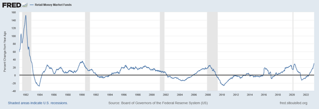 마찬가지로 소매 자금 시장 펀드는 빠르게 성장하고 있습니다. 올해의 증가율은 2008년 이후 가장 높습니다. 기관과 개인은 불확실한 기간 동안 자신의 자금 시장 가입을 늘리는 경향이 있습니다. 이는 고정 수입 자산에 인센티브를 제공하는 비즈니스 및 금리 인상 주기와도 관련이 있습니다. 이러한 추세는 금리 인상의 효과와 시장 참가자들의 두려움이 과거의 심각한 경기 침체 이전 상황과 거의 비슷하다는 것을 나타냅니다.