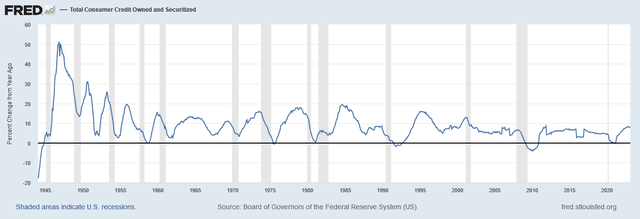 {"originWidth":640,"originHeight":250,"style":"alignCenter","width":640,"height":250,"caption":"연방 준비 은행 경제 데이터 소비자 신용의 전반적인 추세가 우려됩니다. 소비자 신용의 YoY 변화는 2022~2023년에 2011년 이후 최고 수준으로 빠르게 증가했습니다. 소비자 신용 잔액은 경기 침체에 앞서 증가하는 경향이 있으며 신용 성장 모멘텀은 경기 침체가 시작되기 전에 둔화됩니다. 현재 신용 모멘텀 성장은 상당히 둔화되고 있으며 가까운 장래에 낮아질 수 있습니다.
