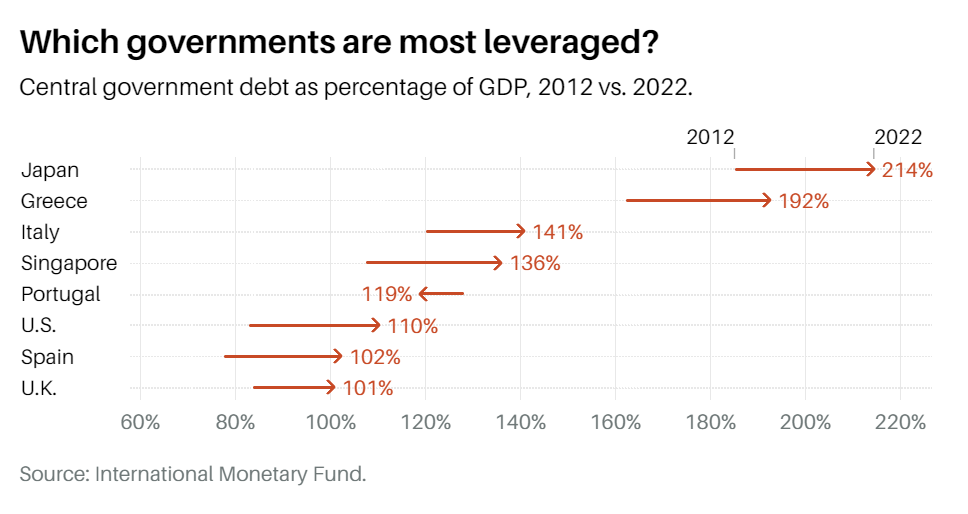 세계 최대의 경제대국으로서 미국이 가장 큰 국가 부채를 안고 있다는 것은 일리가 있는 일입니다. 하지만 GDP 대비 부채비율을 보면 최악과는 거리가 멀다. 규모가 작고 재정적으로 불안정한 개발도상국 외에도 많은 OECD 국가들도 GDP보다 더 큰 국가 부채를 안고 있습니다. 거의 모든 사람들이 지난 10년 동안 상황이 악화되는 것을 목격했습니다.