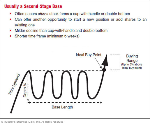 이전에 우리는 최고의 주식이 큰 움직임을 보일 때 일반적으로 "발판"을 형성하는 방식을 살펴보았습니다. 그들은 잠시 상승한 다음, 새로운 차트 패턴을 형성하기 위해 후퇴한 다음 다시 상승하여 돈을 벌 수 있는 여러 기회를 제공합니다. 평평한 바닥은 그 전형적인 예입니다. 그것은 일반적으로 주식이 손잡이가 있는 컵이나 더블 바텀에서 좋은 수익을 올린 후에 형성됩니다. 그것이 종종 2단계 바닥으로 간주되는 이유입니다 .