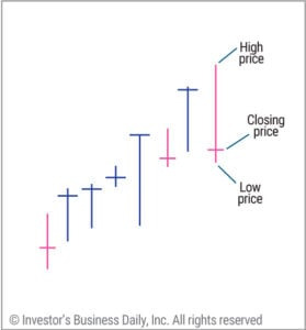 HTI 하이 로우 클로즈 1. 가격: 일일 또는 주간 시간대를 사용하면, 주식 차트의 가격 영역은 가격의 변화를 보여줍니다. 가격 영역 차트의 수직 막대는 해당 요일 또는 주의 주가 범위를 보여줍니다. 가격 막대내의 작은 교차 수평 대시는 현재 가격 또는 주식이 일 또는 주 말에 마감한 곳(종가)을 나타냅니다. 가격 막대의 색상은 주식이 해당 기간 동안 상승( 파란색 )했는지 하락( 빨간색 )했는지를 나타냅니다.