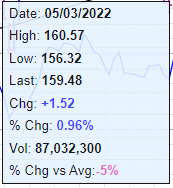 아래 스크린샷에 표시된 것과 같은 데이터 상자를 불러오려면 일간 또는 주간 차트의 가격 영역 내부를 클릭하기만 하면 됩니다. 다음을 포함한 최신 가격 및 거래량 정보를 찾을 수 있습니다.