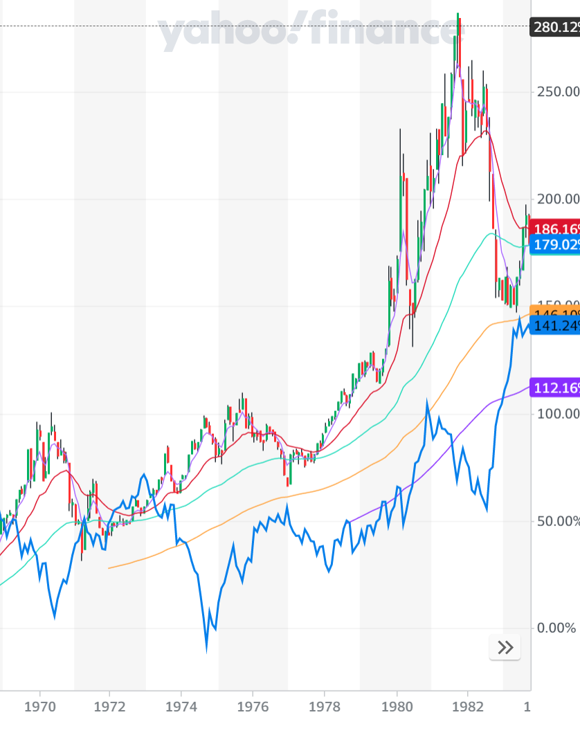 US 10년금리(챠트), S&P500지수(파란선) 비교챠트. 1971년부터 금리의 상승은 지수의 하락, 정체의 모습을 1980년까지 보여준다.
